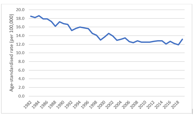 The number of deaths from gynaecological cancers increased from 1,235 in 1982 to 2,150 in 2019. Over the same period, the age-standardised mortality rate decreased from 19 deaths per 100,000 females in 1982 to 13 deaths per 100,000 in 2019.