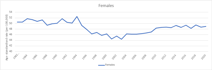 The number of new cases of gynaecological cancers diagnosed increased from 2,954 in 1982 to 6,380 in 2020. Over the same period, the age-standardised incidence rate decreased from 51 cases per 100,000 females in 1982 to 49 cases per 100,000 females in 2020.