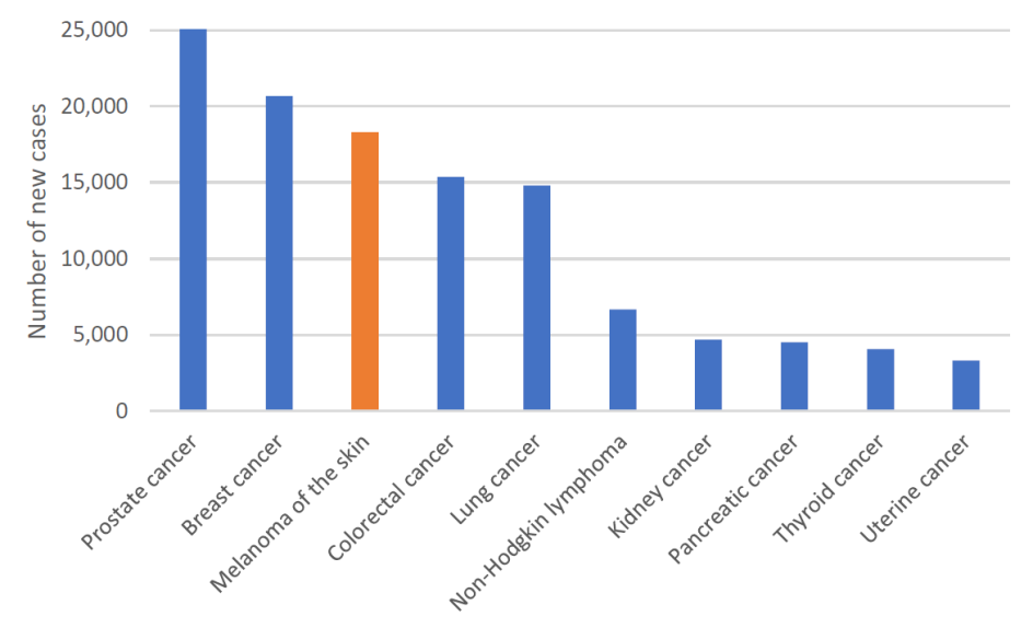 Melanoma of the skin was the third most commonly diagnosed cancer in Australia in 2021. It is estimated that it will remain the third most commonly diagnosed cancer in 2025.